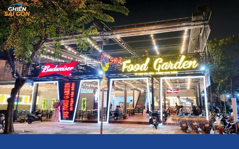 503 Food Garden mang phong cách hiện đại kết hợp sân vườn, không quá sang trọng nhưng được đầu tư chỉn chu với hệ thống đèn dây, bảng hiệu neon và decor trẻ trung, phù hợp giới trẻ check-in.