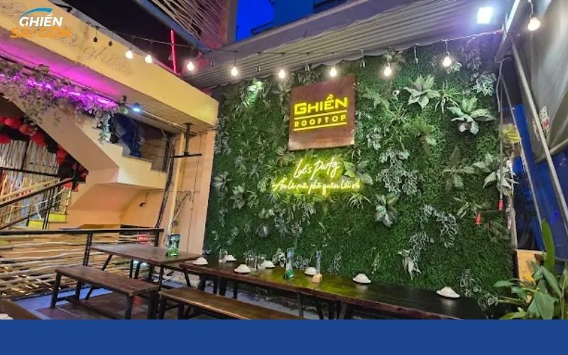 Không gian tại Ghiền Mồi bén & bia mang phong cách bình dân hiện đại, đúng chất quán nhậu Sài Gòn nhưng vẫn gọn gàng và dễ chịu. Quán có 3 tầng lầu rộng rãi với khu vực ngồi trong nhà lẫn ngoài trời, hướng bờ kè thoáng mát, đi nhóm đông vẫn rất thoải mái.