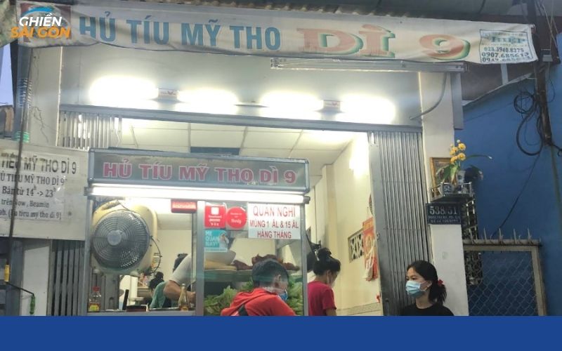 Quán hủ tiếu Mỹ Tho Dì 9 là một địa chỉ ẩm thực giản dị nhưng rất nổi tiếng tại Sài Gòn, nổi bật với hương vị hủ tiếu Mỹ Tho chuẩn vị miền Tây. Quán có không gian nhỏ, vài bàn xếp gọn trước cửa, nhưng luôn đông khách nhờ nước dùng đậm đà, sợi hủ tiếu mềm vừa, kết hợp cùng các topping như trứng cuộn, gan, tim, tôm và ruột heo.