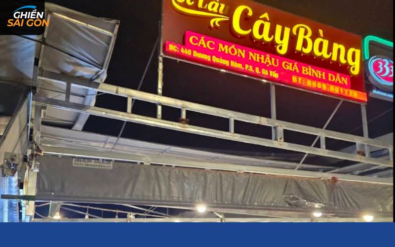 Quán Cây Bàng Gò Vấp là địa điểm ăn uống quen thuộc với không gian rộng rãi, thoáng mát, phù hợp cho những buổi tụ tập đông người. Menu đa dạng cùng mức giá dễ tiếp cận giúp quán luôn đông khách vào buổi tối. Ghiền Sài Gòn đánh giá đây là nơi lý tưởng để vừa ăn uống vừa tận hưởng không khí nhộn nhịp.