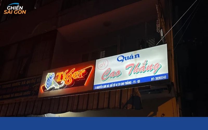 Khu vực Cao Thắng luôn nhộn nhịp vào mỗi buổi tối với nhiều quán nhậu đông khách. Theo ghi nhận từ Ghiền Sài Gòn, quán nhậu Cao Thắng gây ấn tượng nhờ không gian rộng rãi, thực đơn quen thuộc, dễ ăn và mức giá không quá cao. Đây là kiểu quán ưu tiên sự thoải mái, náo nhiệt và phù hợp cho những buổi tụ họp đông người hơn là trải nghiệm sang trọng.